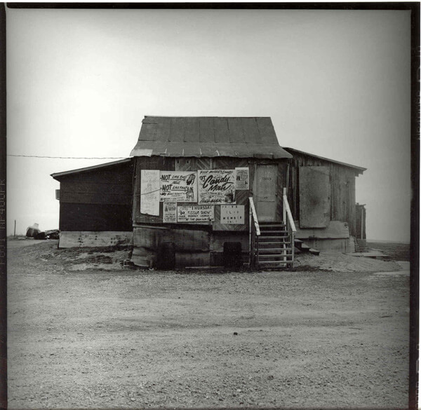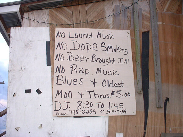 The building is made of unpainted cypress planks, roofed with corrugated galvanized steel that is often referred to as a "tin." It is windowless, but has three doors. The front sports several faded, hand-painted signs. One describes the dress code by saying "not like this" next to a picture of a man with his cap on backwards, and "not like that" next to an image of a man with his underpants showing above his waist. Other signs tell patrons not to bring beer inside, "no loud music" (consistently spelled "lounld"), and "no dope smoking."