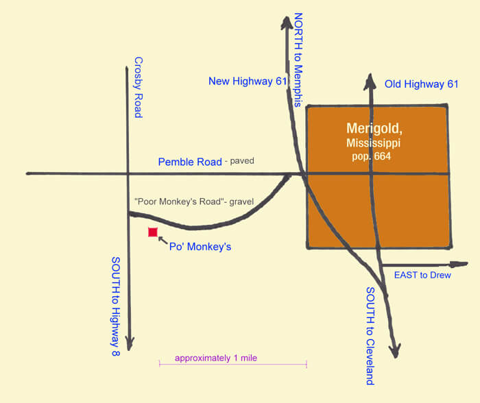 Poor Monkey's sits in a cotton field in Bolivar County, west of the town of Merigold on the Hiter farm, land worked by members of the same family for generations. Monkey's is the only surviving sharecropper shanty on this land, although there are remains of a few others nearby. In the early 1950s, Willie Seaberry, known as Poor (Po') Monkey, began to operate the unused sharecropper house as a lounge.