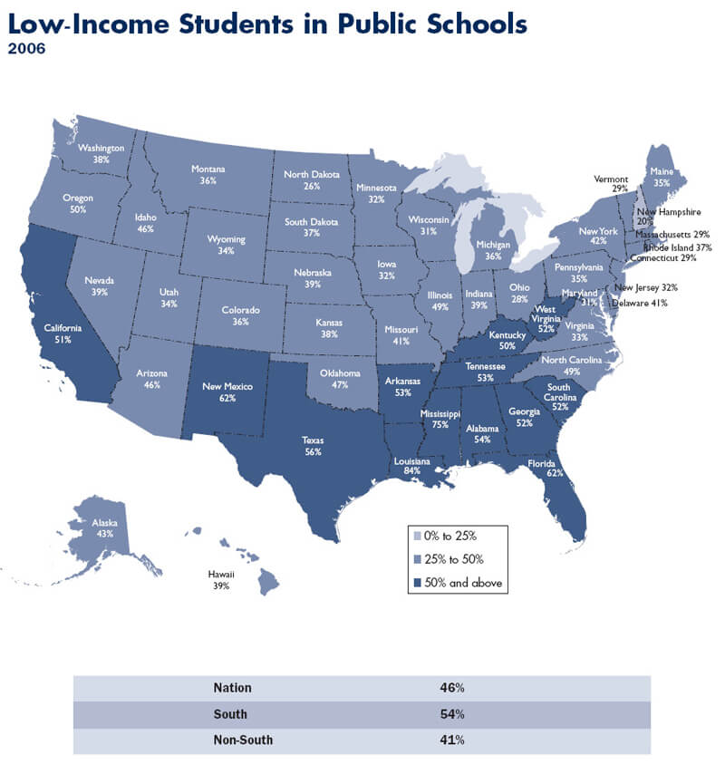 For the first time in over forty years, low-income children constitute a majority of public school students in the US South. Public schools in the fifteen states designated as southern by the Southern Education Foundation have enrolled a majority of low-income students in each of the last three years.1Available data for 2004–2006. The Southern Education Foundation considers the following states as the US South: Louisiana, Mississippi, Florida, Texas, Oklahoma, Alabama, Arkansas, Tennessee, Georgia, South Carolina, North Carolina, West Virginia, Kentucky, Virginia, Maryland. Today the South is the only section of the nation where low-income students make up fifty percent or more of public school enrollment.2In 2007, according to the federal guidelines, a student living in a family of three persons with an annual income of $22,231 or less was eligible for free lunch; a student with an annual family income of $31,765 or less was eligible for reduced-price lunch.
