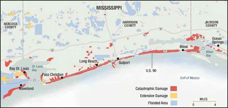 Map of Mississippi Coastal Damage after Hurricane Katrina, September 2005 Data Source: FEMA Mapping and Analysis Center | ![]() |