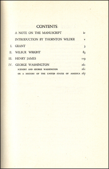 "Writing about Americans comes to be very much what is natural to any one thinking that it is pleasant to be one.... Once in talking and saying that in America the best material is used in the cheapest things because the cheapest things have to be made of the best material to make them worth while making it, it is really that it comes to be a romantic thing that has been so added to the history of living for an entire generation.... This is the American something that makes romance everything. And Romance is Useful Knowledge.... When there are many Americans and there are there is a great deal of pleasure in knowing that not only do they differ from one another but that Iowa and California are very pleasant and very different from one another.... Any one wishing to add a state can add one." |