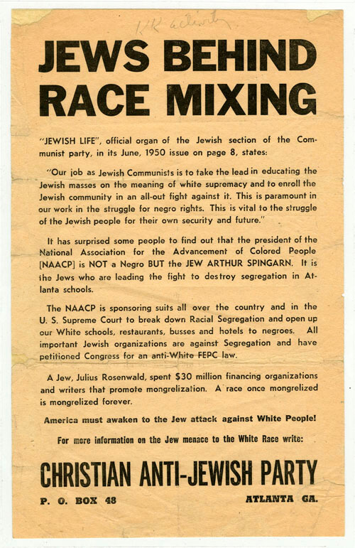 Christian Anti-Jewish Party flyer, circa 1950. Ralph McGill papers, Emory University Special Collections. |
