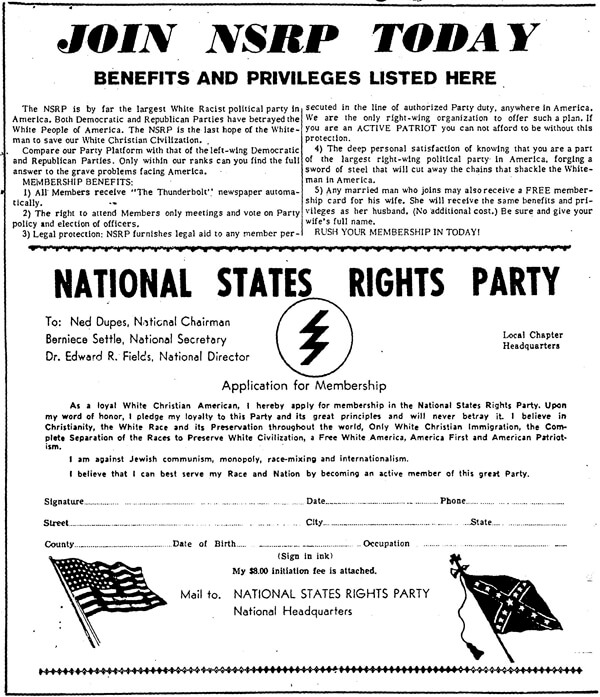 Initially based in Jeffersonville, Indiana, the NSRP permanently relocated to Birmingham, Alabama. The party operated along military lines. Members wore a uniform consisting of a white shirt and black trousers and decorated with a black tie, Sam Browne belt, and armband bearing the party emblem, a thunderbolt superimposed on a Confederate battle flag. At the pinnacle of its political influence, the NSRP claimed to have thirty-six chapters in thirteen states, not only in the South, but also from across the Midwest to the Pacific Coast. Many of these local branches existed in little more than name, however, and estimates of external sources suggest NSRP membership never exceeded 500. Although most of these members were men, women occupied a number of prominent positions within the party hierarchy, including Vice Chairperson Anne Bishop and Secretary Treasurer Bernice Settle.15California Bureau of Criminal Identification and Investigation, Para-Military Organizations in California White Extremist Organizations, Part II: National States Rights PartyThe Present-Day Ku Klux Klan Movement, Report by the Committee on Un-American Activities, House of Representatives, 90th Cong. Ist Sess., December 11, 1967 (Washington, DC: US Government Printing Office, 1967), 13. (Sacramento, CA, 1965), NSRP-4; (unpublished monograph, May 1970), 5, National States Rights Party, Federal Bureau of Investigation File, Part II, ii, 2; NSRP membership application form, box 39, Jewish Community Relations Council of Minnesota Papers, Minnesota Historical Society, St. Paul; The Present-Day Ku Klux Klan Movement, Report by the Committee on Un-American Activities, House of Representatives, 90th Cong. Ist Sess., December 11, 1967 (Washington, DC: US Government Printing Office, 1967), 13.