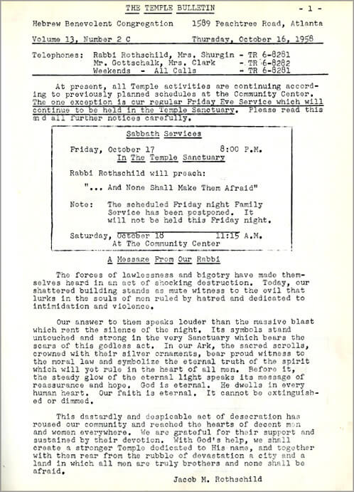 Excerpt from The Temple Bulletin, October 16, 1958. Courtesy of The Temple: Hebrew Benevolent Congregation of Atlanta. |