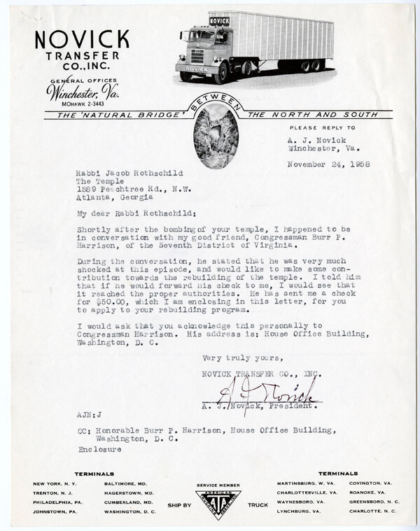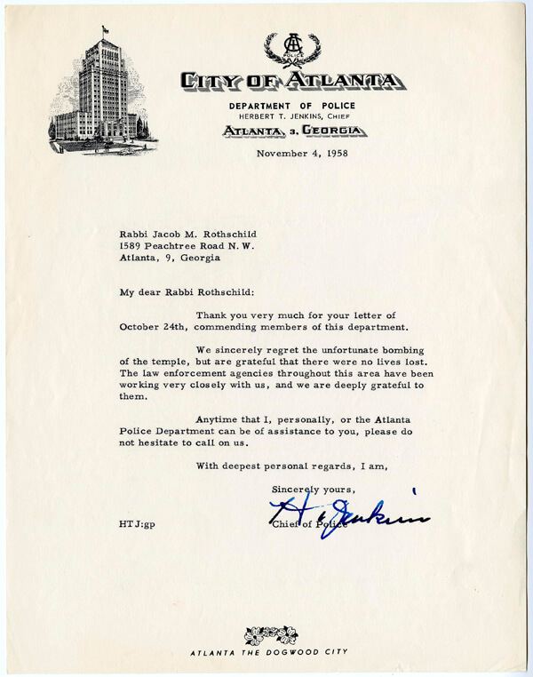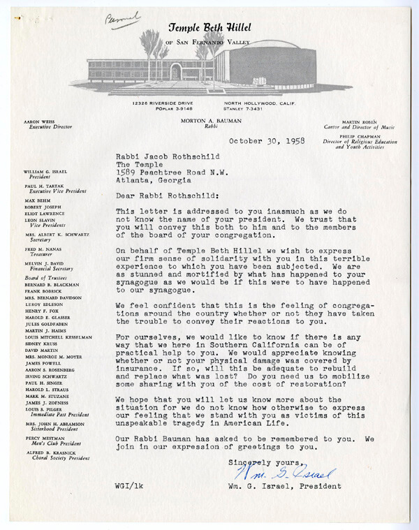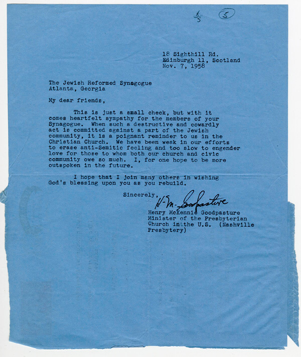 Letters of sympathy sent to Rothschild and the Temple in the aftermath of the bombing. Jacob M. Rothschild papers, Emory University Special Collections. |
