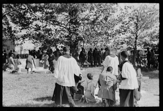 Russell Lee, Library of Congress, Prints & Photographs Division FSA-OWI Collection Reproduction Number: LC-USF33-011901-M2 DLC, Catholic priests blessing members of their congregation, New Roads, Louisiana, 1938.