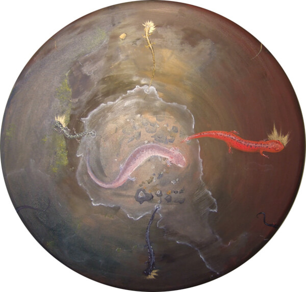 Nevertheless, I find this idea of salamander origins in the Appalachians a powerful metaphor for origins of life. There are points of origin. Each branching on the tree is a point of origin and the beginning of a new line in the story. If we could trace all our origins all the way back, we would find that we salamanders, we hominids, we birds, we slime molds and mosses all came from one place—out of the water and out of the earth. The habitat of most salamanders is the moist earth, the kind of dark place that is recycled from death, yet lush with life. For me an image that bores into the center of the earth, to our origins, is equally sacred as one that opens up into heaven. Thus I have strived to honor this origin story with an earthy mandala.