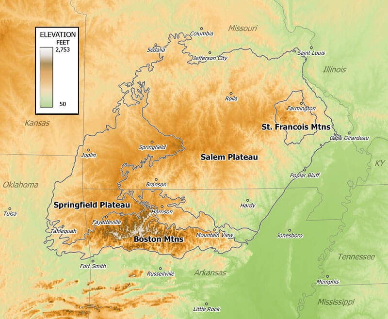 The Ozark Highlands region comprises the southern half of Missouri, northern third of Arkansas, and a small fraction of northeastern Oklahoma, which geographers generally delimit by rivers: the Missouri on the north, the Mississippi on the east, the Grand on the southwest. Geographic characteristics that distinguish the Ozarks as a region include the general ruggedness and vertical topography, and the relative age of surface rocks being older than those in adjoining areas.17Milton Rafferty, The Ozarks: Land and Life(Norman: University of Oklahoma Press, 2001). The karst topography of the Ozarks creates many of these geographic characteristics; the soluble rock (dolomite and limestone) dissolves as groundwater filters through it. Much of the precipitation in karst areas carries nutrients critical to plant growth directly into the groundwater, well below rooting depths of most agricultural plants.18Tom Aley, "Karst Topography and Rural Poverty," Ozarkswatch 5.3 (1992), 19-21. Land cover in the Ozarks relates directly to these effects of the karst topography; unlike the surrounding regions, large-scale monoculture agriculture is untenable in the Ozark hills. Deciduous forests of oak-hickory-pine mixes with intermittent cedar glades compose the Ozarks’ primary landscape feature.