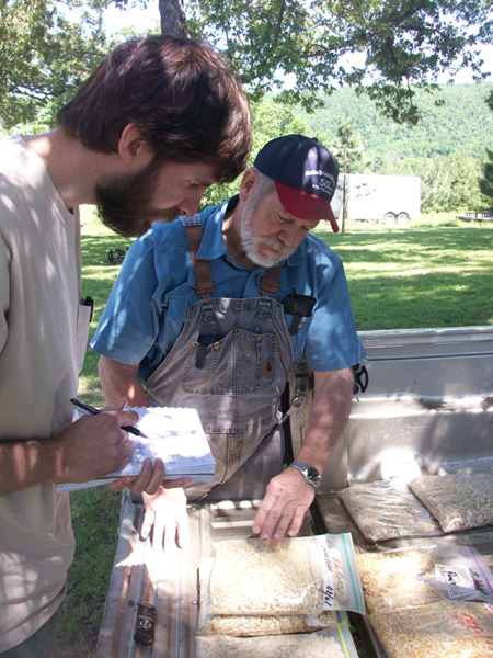 Zachariah McCannon, Searcy County miller Rick Horton discussing local corn varieties with University of Georgia anthropology graduate student James Veteto, Searcy County, 2009. |
