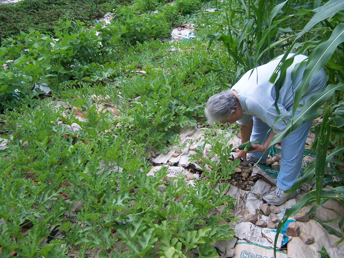 Brenda Smyth, Old chicken feed bags in garden with rocks on them as mulch, Searcy County, Arkansas, July 2009. |