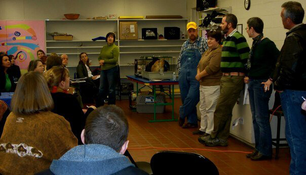 We set up the newsgroup "Citychickens" to trade advice about local breeders, ideas for coop designs, predator updates (coyotes and owls), and suggestions about where — or where not — to acquire birds. We handed the class off to another team of instructors two years ago but taught it again to about eighty people at the 2009 Georgia Organics annual conference. This February, I led an abbreviated version for the first-ever Chicken Symposium, sponsored by the Oakhurst Garden.