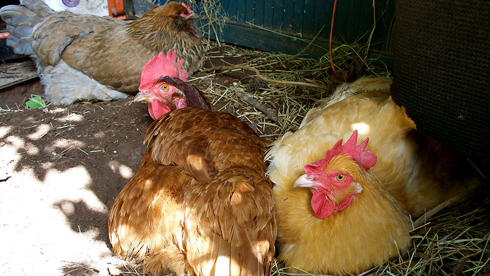 Allison O. Adams, Lucy (Rhode Island red) and Ethel (Buff Orpington) enjoy a bath of dust and sunshine in Adams’s backyard, Decatur, Georgia, November 2009. |