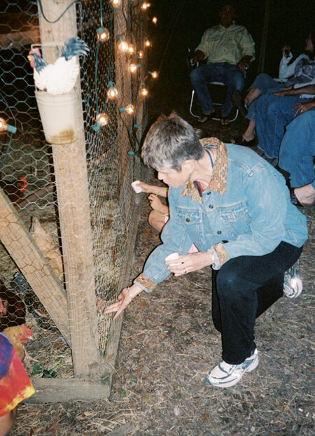 By the fall, we had had so many visitors that we decided to throw a party to celebrate all things chicken. The first Cluckapalooza, now an annual event, drew about seventy-five friends in September 2004. We strung lights around the coop and decorated it with flowers and art. Guests admired both the "east wing" (my side) and the "west wing" (the neighbors') of the coop. Everyone feasted on a potluck dinner, including deviled eggs from our hens and treats from my garden, now enriched with copious chicken manure. Games included a clucking competition and a Funky Chicken dance-off. Musicians brought their instruments and played their favorite chicken songs (there are more than you'd think).