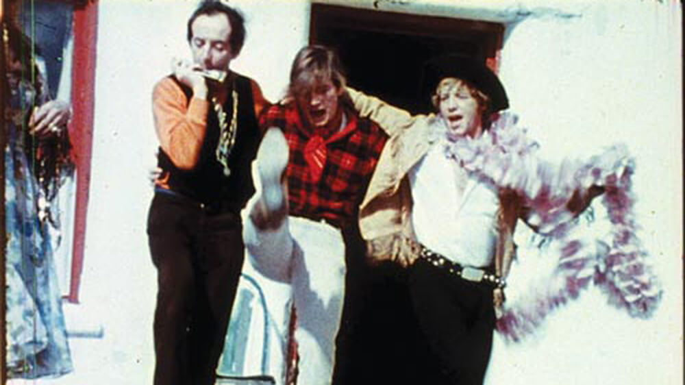 Still from Andy Warhol's Lonesome Cowboys, 1968. Image depicts Taylor Mead, Joe Dallesandro, and Eric Emerson. Andy Warhol Lonesome Cowboys, 1967–68 16mm film, color, sound, 109 minutes ©2010 The Andy Warhol Museum, Pittsburgh, PA, a museum of Carnegie Institute. All rights reserved. Film still courtesy of The Andy Warhol Museum. |