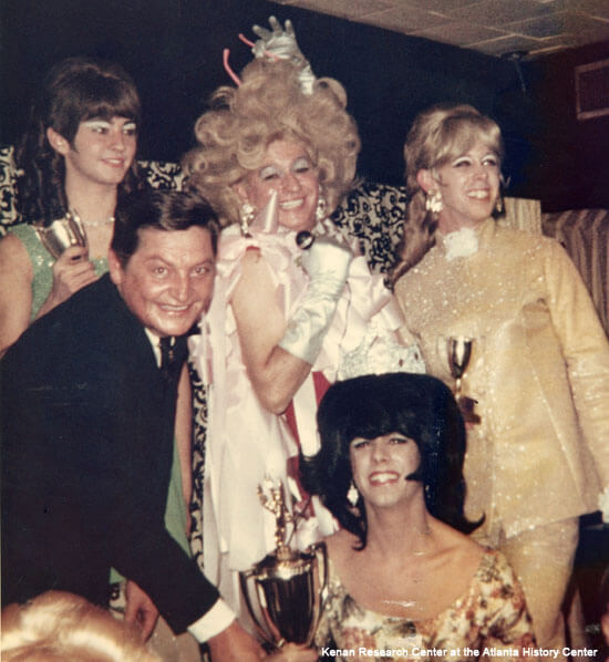 Billy Jones moved to Atlanta in the late 1920s. Following his military service during World War II, Jones worked for thirty years at the Franklin Simon department store, where he would become known for his traffic-stopping window designs. | In the mid 1960s, using the stage names Phyllis Killer and Shirley Temple Jones, Billy Jones became a popular female impersonator. He is pictured here (top center) during one of the Miss Joy Lounge pageants. At this time, an Atlanta city ordinance had banned cross-dressing. |