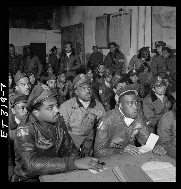 Photographer unknown, Tuskegee Airmen gathered at a U.S. base after a mission in the Mediterranean theater, February 1944. Courtesy of the United States National Archives and Records Administration. |