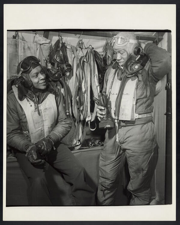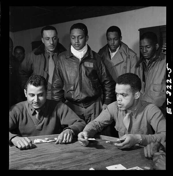 Toni Frissell, Tuskegee airmen Woodrow W. Crockett and Edward C. Gleed (top left), Photograph of several Tuskegee airmen attending a briefing (top center), Tuskegee airmen playing cards in the officers' club in the evening (top right), Members of the 332nd Fighter Group (bottom left), Portrait of Tuskegee airman Edward M. Thomas, standing (bottom center), Col. Benjamin O. Davis, full-length portrait, and Edward C. Gleed, wearing flight gear, standing next to airplane, and looking upward (bottom right), Air base at Ramitelli, Italy, March 1945. Courtesy of the Library of Congress. |