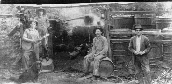 Hosea Thomas' still workers in Endicott, (Franklin County) Virginia, 1915. The Martin, Rake, and Thomas families trace their origins to Ireland where local residents learned to make liquor (known in Ireland as "potchin") to supplement farm income. Photo courtesy of the Blue Ridge Institute of Ferrum College. |