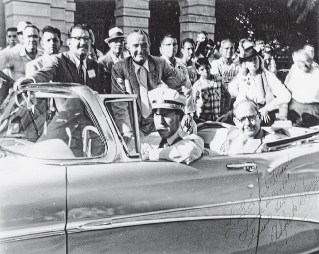 Alfredo G. Garza, LULAC national president Felix Tijerina (in backseat) with Senator Lyndon B. Johnson, accompanied by Officer Jose Davila and Alfredo Garza, in a 1958 LULAC parade in Laredo, Texas, LBJ Library. From Fighting Their Own Battles: Mexican Americans, African Americans, and the Struggle for Civil Rights in Texas by Brian D. Behnken. Copyright © 2011 by the University of North Carolina Press. Used by permission of the publisher. |