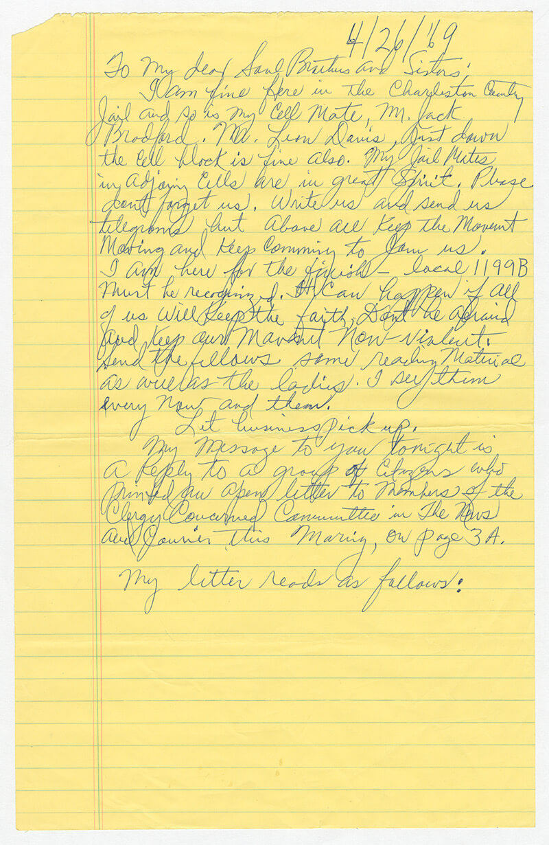 Selected page from Ralph David Abernathy's Letter from a Charleston Jail, April 1969. Courtesy of SCLC records, MARBL, Emory University.