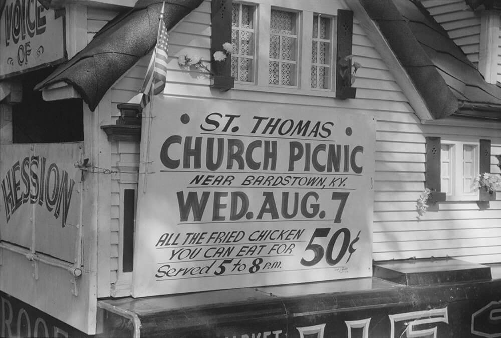 Marion Post Wolcott, Poster advertising church picnic near Bardstown, Kentucky, August 7, 1940. Library of Congress Prints and Photographs Division, FSA/OWI Black & White Negatives Collection, LC-USF33-030987-M4. |