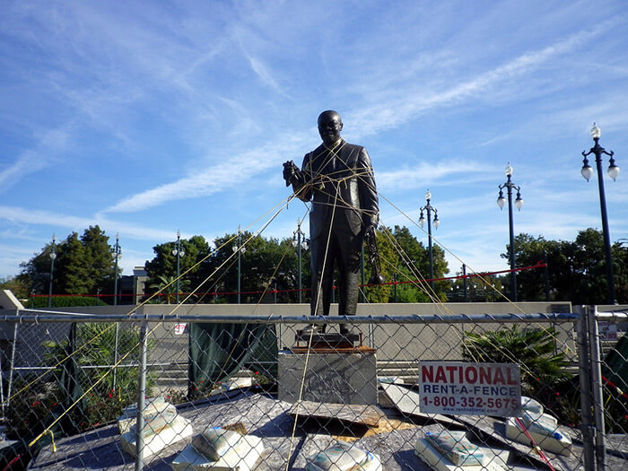 Cory Doctorow, Roped-up Satchmo statue, Louis Armstrong Park, New Orleans, Louisiana, 2010. Area closed off since contractors poured pavement with bad cement and damaged the statue. |