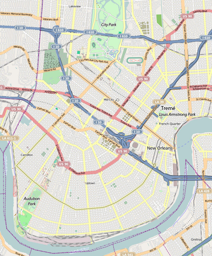 New Orleans map showing Louis Armstrong Park in Tremé, City Park, and Audubon Park. ©OpenStreetMap contributors, CC-BY-SA. |