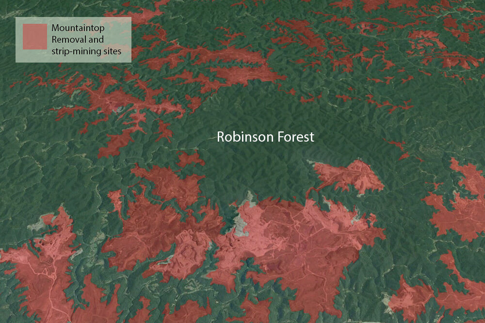 Map showing Robinson Forest and surrounding sites of mountaintop removal and strip-mining, Robinson Forest, Kentucky, 2012. Map by Southern Spaces, created with Google Earth mountaintop removal "Extent of Mining Survey" layer courtesy of iLoveMountains.org. |