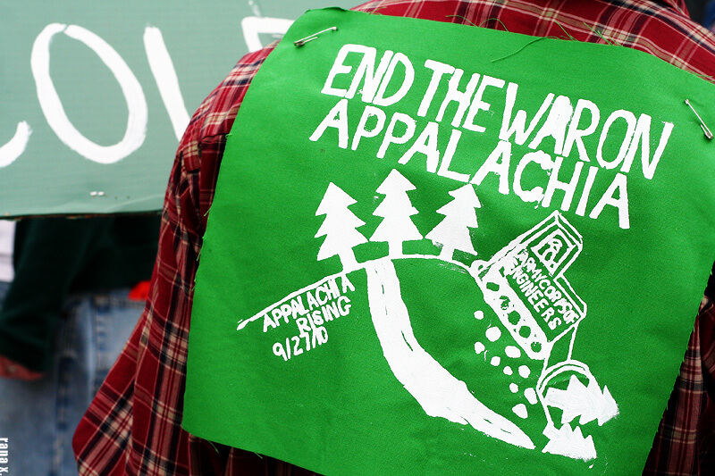 As part of the "Appalachia Rising: Voices from the Mountains" conference held in September 2010, protesters participated in a day of action in the nation's capital to increase awareness of mountaintop removal mining (MTR) and its impact on Appalachian communities. Described as both a mobilizing effort and an opportunity for civil disobedience, the protest resulted in over one hundred arrests during a sit-in on Freedom Plaza. While mountaintop removal is often considered an Appalachian problem, this protest and its depiction of the federal Army Corps of Engineers points to the complexity of environmental issues that transcend regional boundaries.