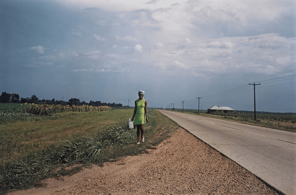 In a William Eggleston photograph currently on display at the Metropolitan Museum of Art, a young African American woman wearing a lime green dress and a shower cap walks down a road. She is centered and small. The landscape around her—the flat farmland, the big sky, the tin-roofed shack, and the two-lane highway—marks the place as the Mississippi Delta. It is the kind of road local people drive to reach Memphis or Clarksdale or walk to reach churches and stores and the gravel lanes that lead home. It is the kind of place where civil rights activists fear meeting sheriffs and folklorists dream of finding blind blues musicians. Farm Security photographers worked here two decades earlier, shooting pictures of southern rural poverty, and in 1970, the want remains. This is not a very promising place to make a life, no matter what the woman is carrying in her bag. It is also, after Walker Evans, not a very promising place to try to make an original photograph.