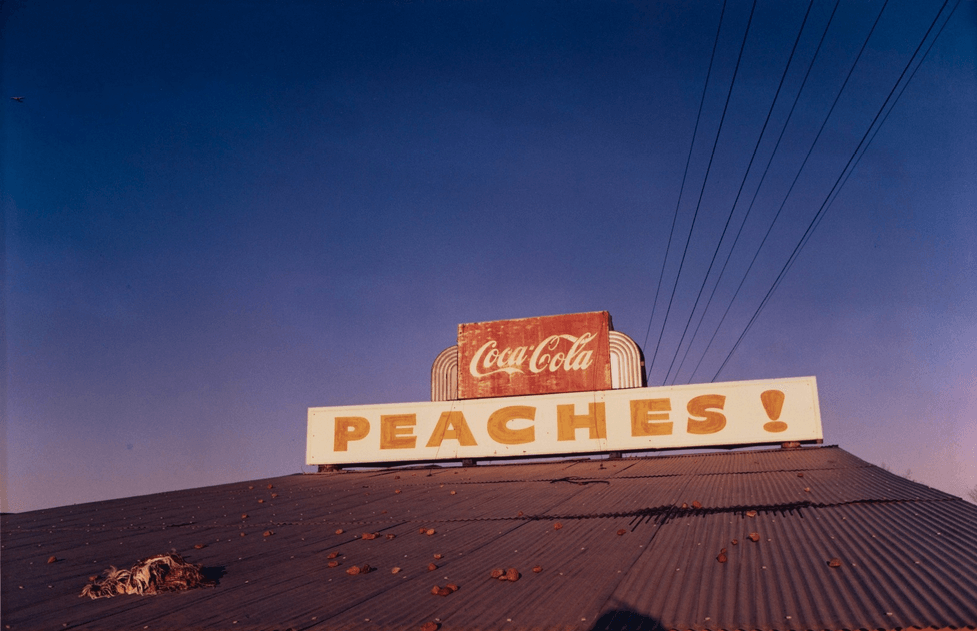 Shot straight-on from eye-level in black and white, Eggleston's Untitled, 1971, an image of a Coca-Cola and peaches sign, could be a Walker Evans image. The color—the blue sky cut by power lines, the faded Coca-Cola logo, the orange letters spelling "PEACHES!" begin to suggest something new, but it is the angle of the shot—looking up from the lip of a rusty corrugated tin roof at the sign—and the depth of field that complete the transformation. Eggleston manages to make this typical Evans subject his own by erasing flatness and adding color. Even more like an Evans is a straight, eye-level 1974 shot, also untitled, of a dull yellow shack with an orange closed sign in what must have been a take-out window. The rusty air conditioner, covered by a little awning that echoes the bigger awning over the door and window, is just the kind of detail Evans would have picked up on to juxtapose the old and the new if window air conditioners had been invented during his classic period.