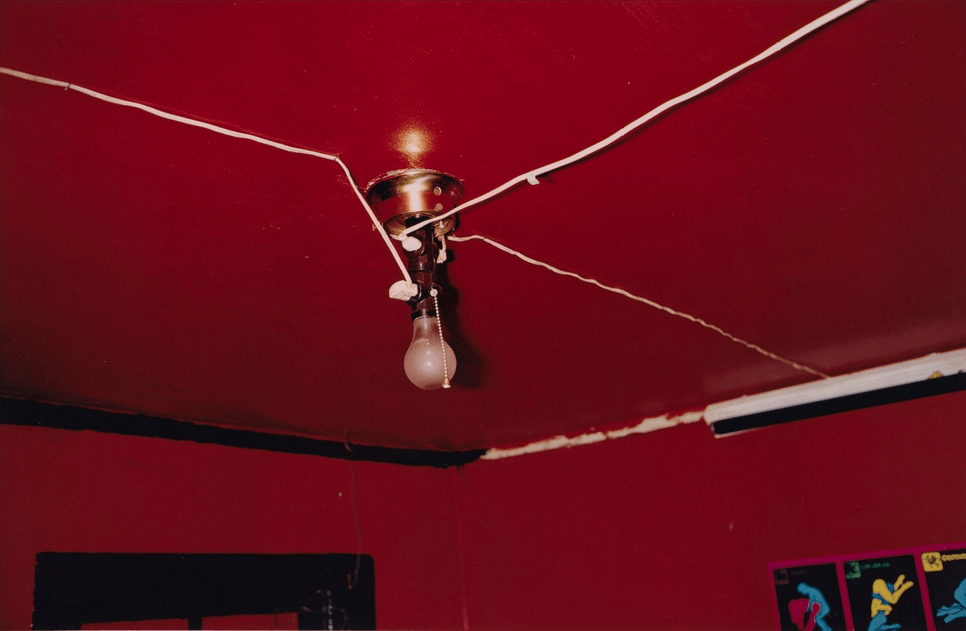Untitled (Greenwood, Mississippi), 1980, perhaps Eggleston's most famous image, belongs with this set. The color is key—the ceiling and walls of this room have been painted a deep, blood red. Once again, Eggleston uses the corner—the intersection of two walls and the ceiling in the low center of the shot to create a sense of space. Just above the corner, slightly left of center in the image, is a light fixture with a bare bulb and an on/off chain. Three white extension cords plugged into the fixture and stapled to the ceiling lead out to the walls and sizzle against the ceiling color. Eggleston remembers shooting the image while lying in bed with friends talking—that they also had been doing other things is implied—and the bottom edge of a poster depicting the positions of the kama sutra in the photograph amplifies the sexual atmosphere. "I think red is a very difficult color to work with," he says in an interview for the BBC video. "I don't know why. It's as if red is at war with all the other colors."7Holzeimer and Cocker, The Colourful Mr. Eggleston.