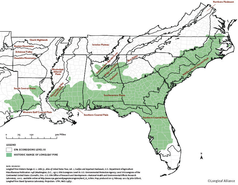 EPA ecoregions level III and historic range of longleaf pine, Map by Longleaf Alliance. Reproduced by permission of Longleaf Alliance. |