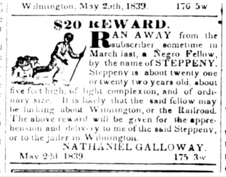 Advertisement announcing reward for runaway slave, Wilmington Advertiser, May 24, 1839. Courtesy of the North Carolina Runaway Slave Advertisements database. |