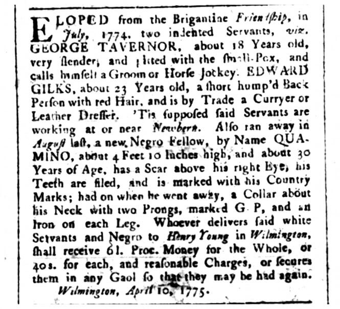 Advertisement for a runaway slave, North Carolina Gazette, May 5, 1775. Courtesy of the North Carolina Runaway Slave Advertisements database. |