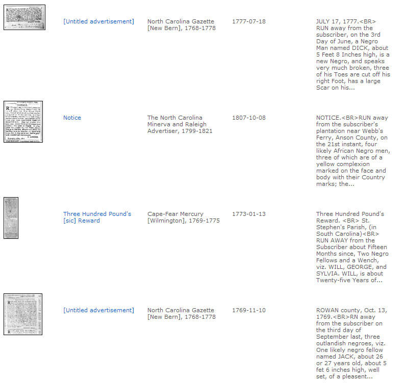 The University of North Carolina at Greensboro (UNCG) and North Carolina Agricultural and Technical State University (NC A&T) have launched the North Carolina Runaway Slave Advertisements project, a database of all known runaway slave ads in North Carolina newspapers between 1751 and 1840. With its comprehensive focus, the project is a useful resource for scholars and students interested in the history of slavery and resistance. In addition to scanned advertisements, the database includes transcripts and rich metadata for easy querying of the approximately 2400 ads. Additonally, project staff have provided some brief historical context for researchers. Samantha Winer, a digitization and transcription assistant, writes that this project offers, "insight not only into conditions and lifestyles experienced by the slaves but also into the plantation economy."1Samantha Winer, "A brief history of slavery in North Carolina," North Carolina Runaway Slave Advertisements, 1751–1840, http://libcdm1.uncg.edu/cdm/history/collection/RAS.