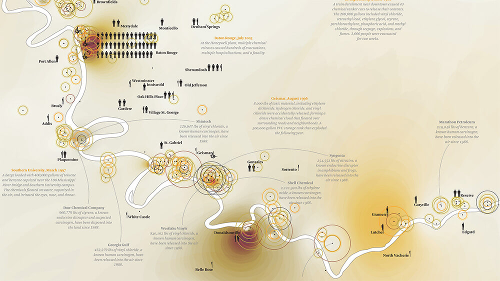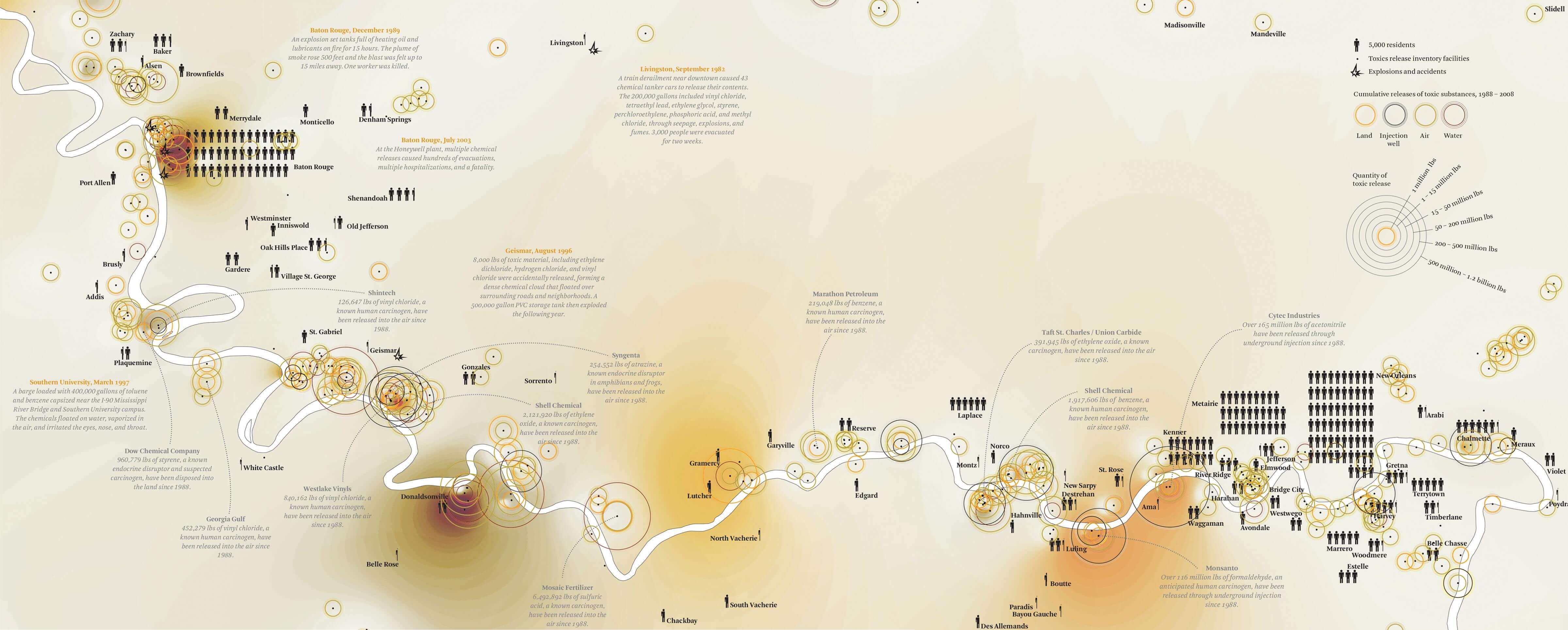 Compared with similar industrial areas in other parts of the country, Louisiana's industrial corridor is more densely populated, so pollutants generated have a greater impact. In the past, industries operated behind the veil of landscaped gates and were subjected to very little public oversight in terms of pollution. In 1986, Congress passed the Emergency Planning and Community Right to Know Act (EPCRA), which mandated the establishment of a publicly accessible Toxics Release Inventory (TRI). Overseen by the US Environmental Protection Agency, the TRI is a publicly searchable database of the industry's self-calculated, self-reported chemical releases. This map shows population centers adjacent to cumulative toxic releases (into the air, land, water, and via injection well) as reported between 1998 and 2008 in the TRI. The visual display of this data reveals the dangerous proximity of people and industry that resulted from a dearth of planning, industrial explosions, accidents, and spills—an inevitable component of business operations—exceed these legal releases. Efforts to improve overall safety include the international Responsible Care program, started by the chemical industry in the mid-1980s. However, mechanical deterioration, human error, and natural disasters will always produce failures. An event like the 2010 Deepwater Horizon oil well blowout is anomalous only in its extreme size.