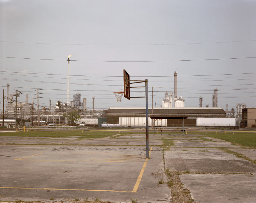 The first part of Petrochemical America consists of photographs taken by Misrach in the riverside communities between New Orleans and Baton Rouge, with extended captions that offer windows into the history of the region. He takes a broad view of his subject: there are pictures from restored plantation homes, pictures of churches and dwellings, and pictures of roadside quirks—a cow statue, a "hot lunch" sign with the lettering falling off. But the ubiquity of industry is the driving theme of these photos. As a backdrop for grasslands, swamps, and the river itself, the towers and tanks of chemical plants take on an eerie beauty in Misrach's spectacular landscapes. In photographs of human habitat, they have a more sinister aspect—outsized in comparison to modest homes; implicated in the desolation of an empty basketball court.