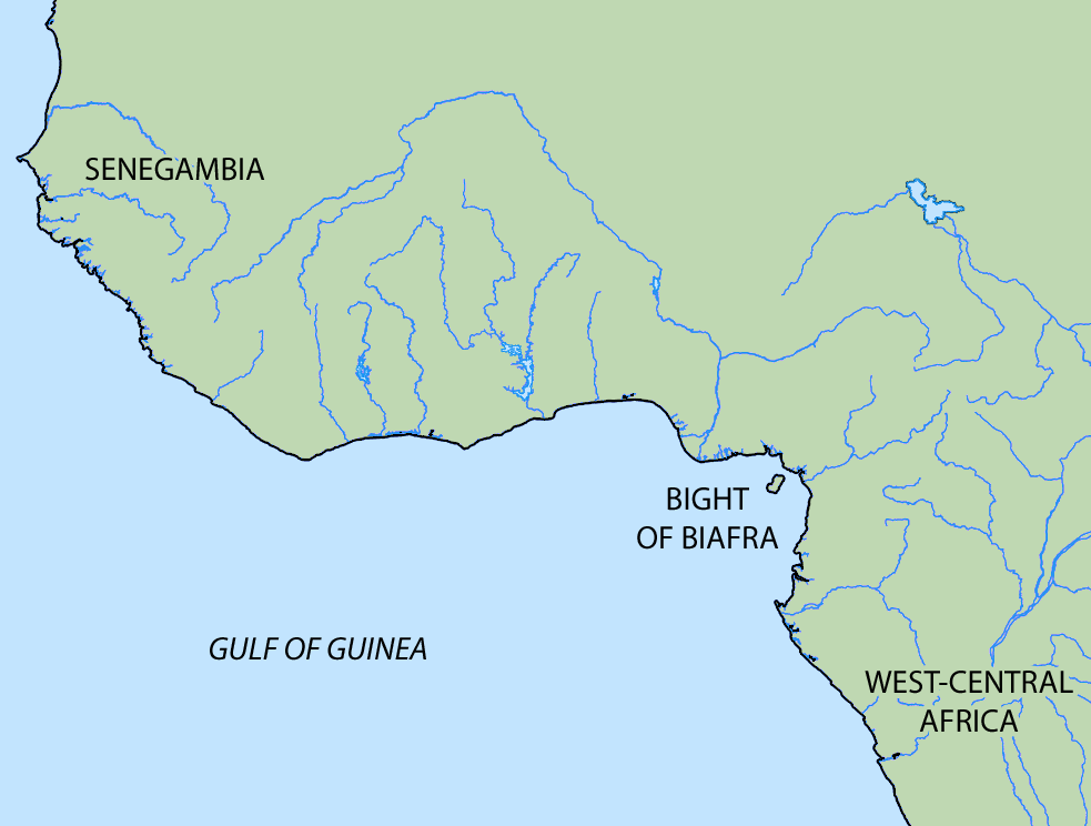 Map of west Africa depicting the prominent regions of origin of Lowcountry Africans, 2013. Map created by Southern Spaces. |