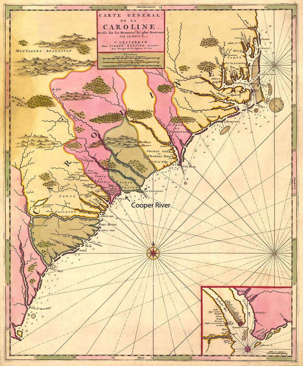 General Map of the Carolinas with location of the Cooper River indicated, Amsterdam, 1683. Map by Nicolas Sanson. Courtesy of the Birmingham Public Library Cartography Collection, SouthCarolina1683a.sid. |