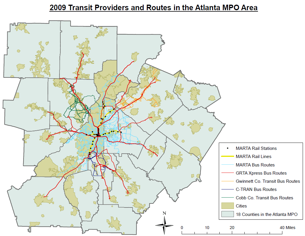 Transit providers and routes in the Atlanta MPO area, 2009, Plan 2040, Appendix T-2, Atlanta Regional Commission. |