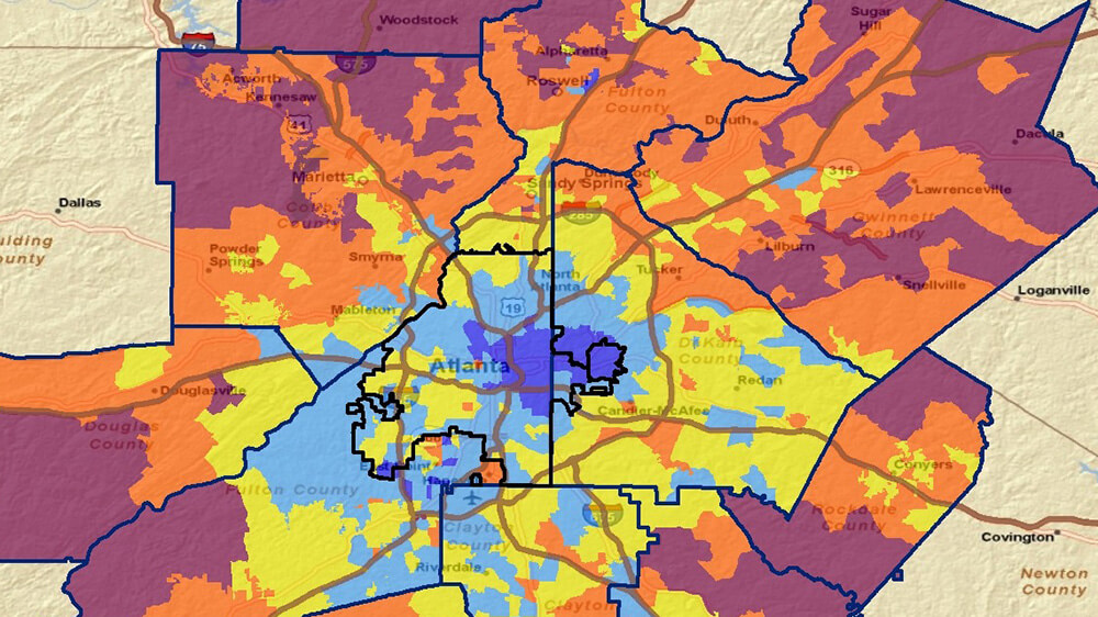 Percentage of metro Atlanta black residents by 2010 census block group, 2013. Data from Social Explorer. |