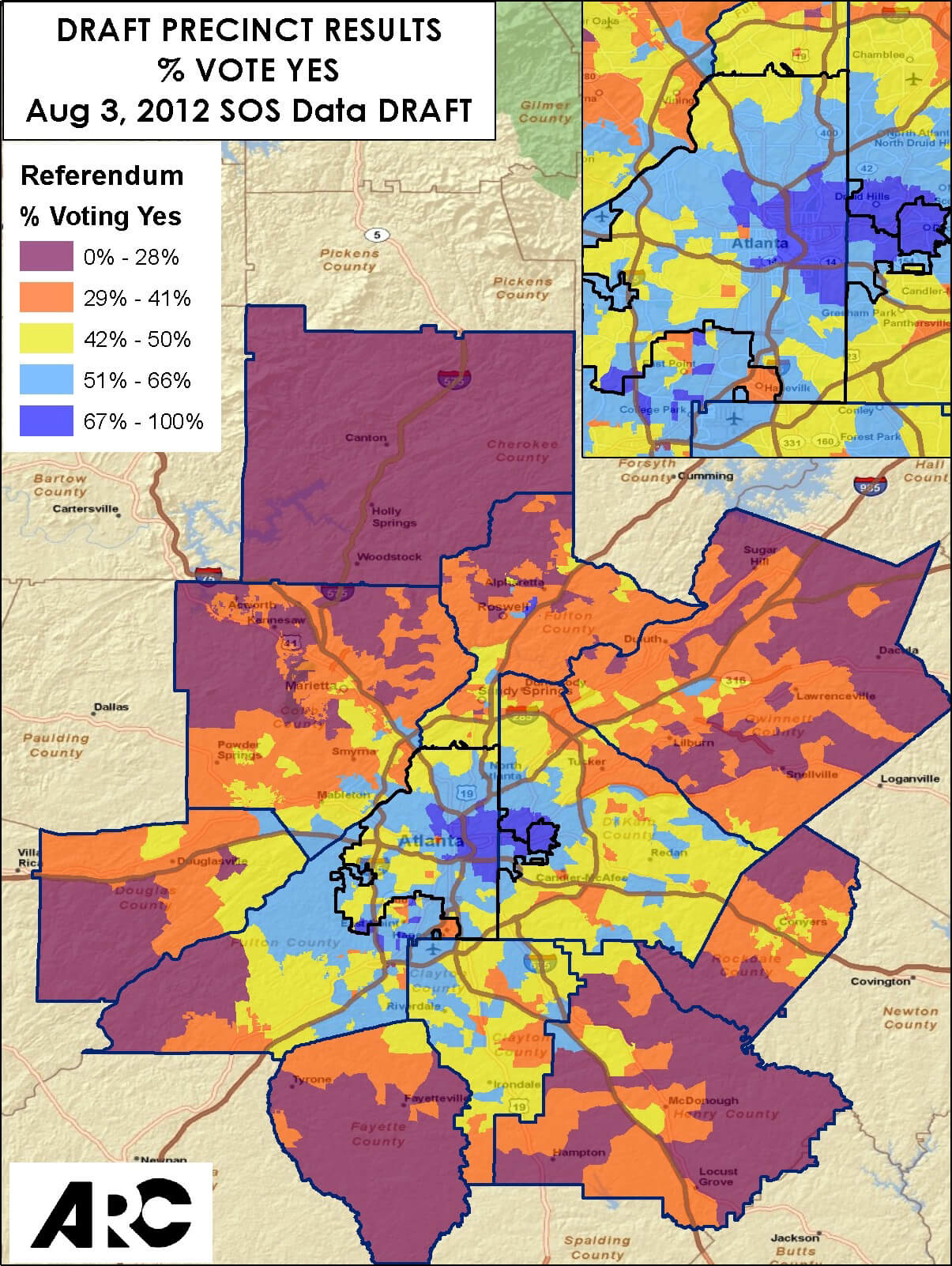 Percent of "Yes" vote in T-SPLOST referendum by precinct, August 2012, Atlanta Regional Commission. |