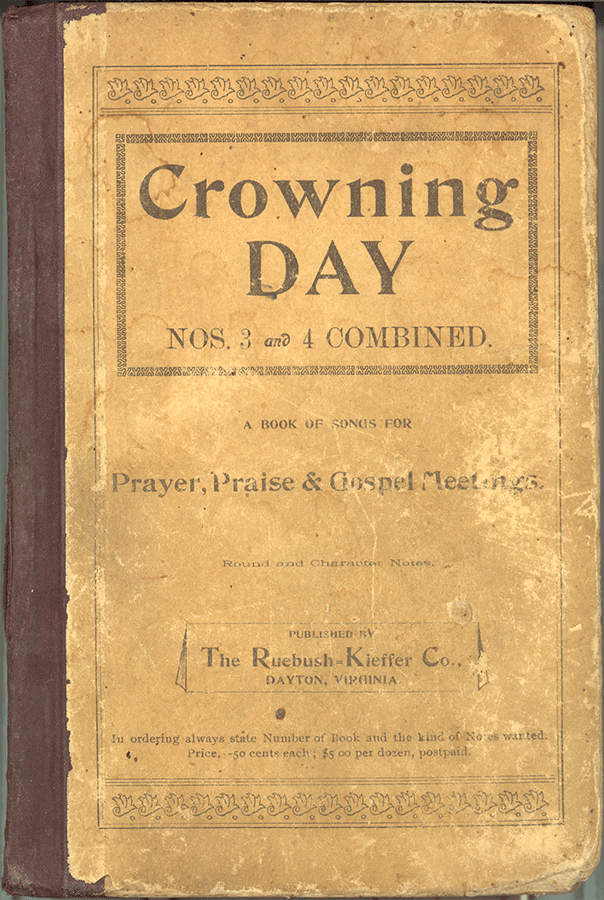 Front cover of Crowning Day (Dayton, VA: Ruebush-Kieffer, 1900). Courtesy of Douglas Harrison. At the end of the nineteenth century and into the first three decades of the twentieth century, southern white gospel was dominated by convention singings that relied on the regular release of small octavo shape-note songbooks such as Crowning Day. |