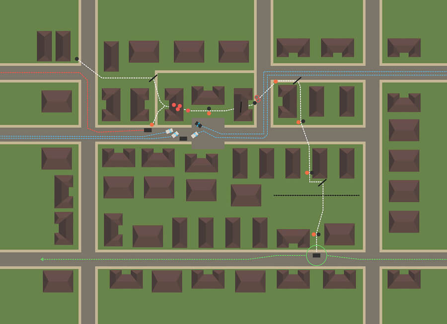 Map of long take from "Who Goes There," 2014, from We Keep the Other Bad Men from the Door, a graphic tribute to HBO's True Detective. Infographic by Nigel Evan Dennis. Courtesy of Nigel Evan Dennis. |
