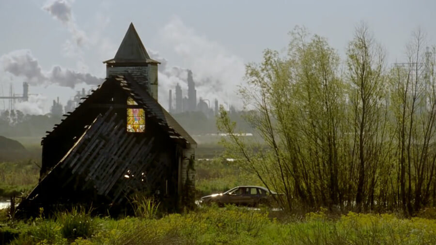 If you have followed Southern Spaces's coverage of Petrochemical America, you will recognize the images that open True Detective, beginning in the title sequence with Sugar Cane and Refinery, a photograph by Richard Misrach of a dirt road through a cane field, terminating in a ditch.2Richard Misrach and Kate Orff, Petrochemical America (New York: Aperture Foundation, 2012), Plate 20, page 50. Patrick Clair, the director of the title sequence, pitched the aesthetic of Petrochemical America explicitly to HBO when presenting his vision for True Detective's opener. See Patrick Clair and Jennifer Sofio Hall, "True Detective: Opening Title Sequence Concept," (Proposal presented at the Original pitch proposal produced by Elastic.tv and Antibody for the title sequence from True Detective, March 9, 2014), http://www.scribd.com/doc/211405775/Original-Pitch-for-Title-Sequence-from-True-Detective. An oil refinery shrouded in smog looms over it. It's a busted up Emerald City, desaturated and toxic, an unreal city in an industrialized Oz. HBO has three shows set in Louisiana: Treme, reimagining a New Orleans broken by flood and evacuation; True Blood, swamp-and-vampire melodrama full of bodies and camp and carnivalesque violence; and True Detective, a show that might fall under a genre called Louisiana apocalyptic noir.3Each Louisiana-based HBO depiction offers smart and problematic depictions. Treme, particularly, lovingly (and perhaps cruelly) recreates the immediate years after Katrina, from drooping ceiling fans in flooded homes to the talismanic power of normal work and local music to get through the grief. What stands out in True Detective is its uncanny evocation of southern Louisiana: a place simultaneously real and unreal. Like Petrochemical America, this genre is concerned with lifting the veil on the dirty truths of the wetland, not so much the titillations of satanic murder sprees but petroleum conspiracy and ecocide. True Detective's big reveal—which does not come when Rust and Marty catch the deranged, stereotypical murderer, but accumulates from the title sequence—is that the southern Louisiana land- and waterscape lies at the nexus of corporate-produced inequality, fragile bodies, toxic waste, indigence, political bullying, and an unruly ecosystem.