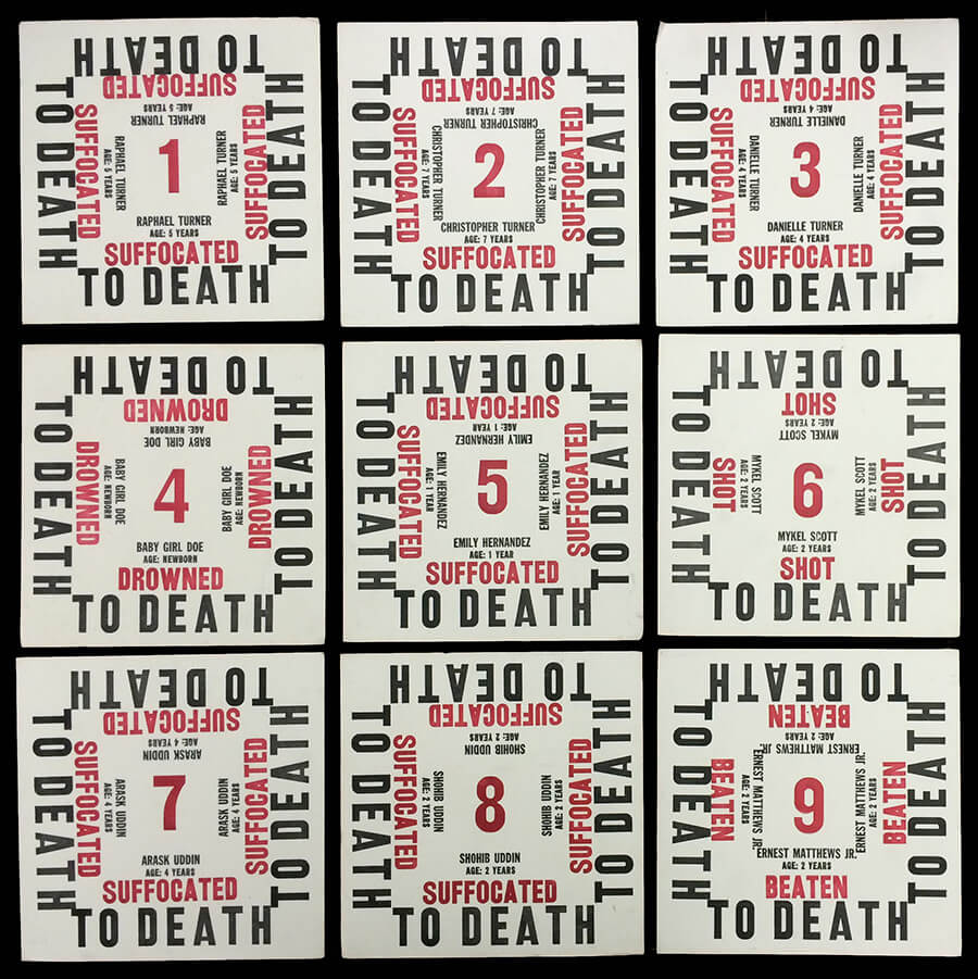 Kennedy relies less on traditional locales for exhibiting his art, such as galleries or museum spaces, and instead prefers more direct and democratic communication with the public. He sells prints online for $25 and in-person at local fairs. When he exhibits his work in museum spaces, Kennedy utilizes the space in both creative and political ways. For example, viewing the gallery exhibition of Kennedy's The Children Don't Count, a multiyear project dedicated to children killed in Chicago in the early 1990s, required visitors to walk over a series of prints bearing the name of a child and how his or her death occurred. Sample prints from the first instance of The Children Don't Count in MARBL's Kennedy & Sons collection remembers Chicago children who died in 1992.