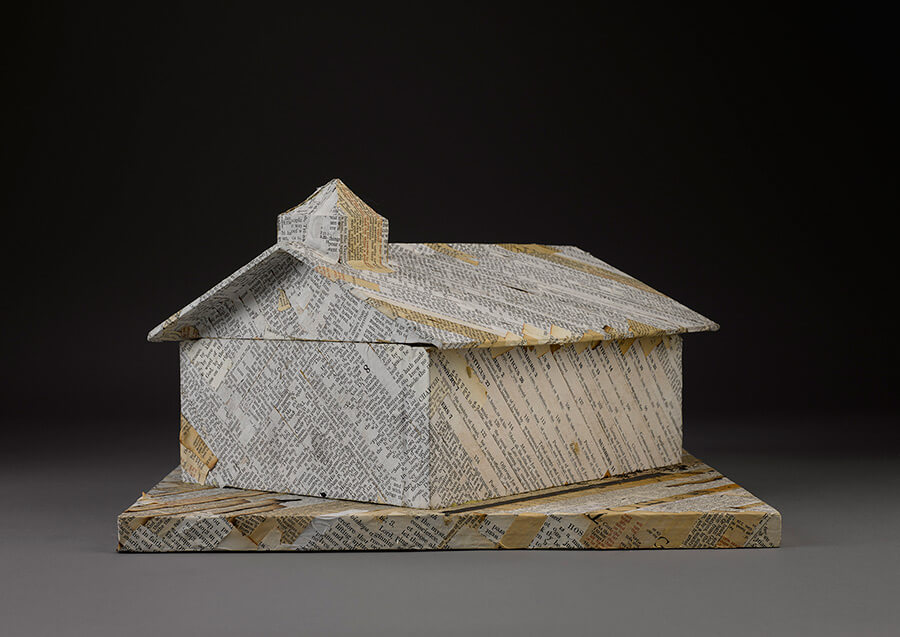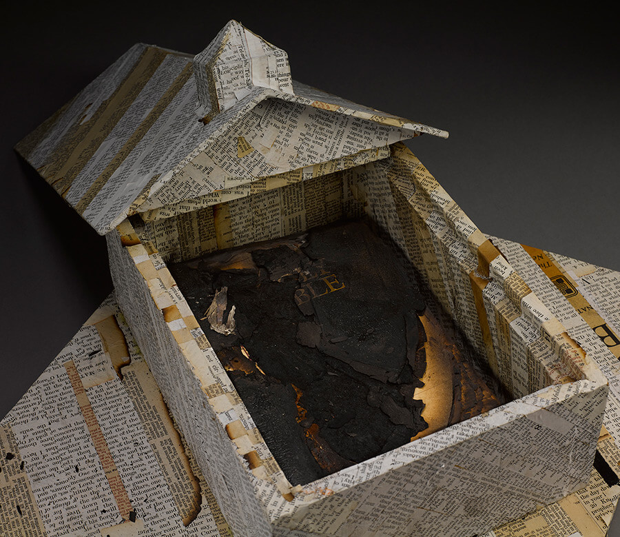 Kennedy's artists' books combine the written word he privileges in his posters with the provocative space of a church building decorated with long strips of bible pages that leap almost flame-like across the model building and onto its roof. The words of varying size and font wrap the building with flowing ribbons of text. While some of the text is legible, its function here is not to represent a literal, scriptural message, but rather to emphasize the power of the biblical words that survived the church burnings. The building itself, despite the ruin and decline suggested by the ashes scattered below it, emanates an otherworldly power. Upon close examination of the model building, it is apparent that the roof of the church can be lifted, revealing a charred Bible nestled in its core. The experience of opening the church sculpture is akin to that of opening a treasure chest: awe, disbelief and a certain reverence. In addition to highlighting the power of the violence that resulted in the series of fires the model church commemorates, Kennedy's sculpture emphasizes the imminent power of the communities and their sacred texts that have survived.