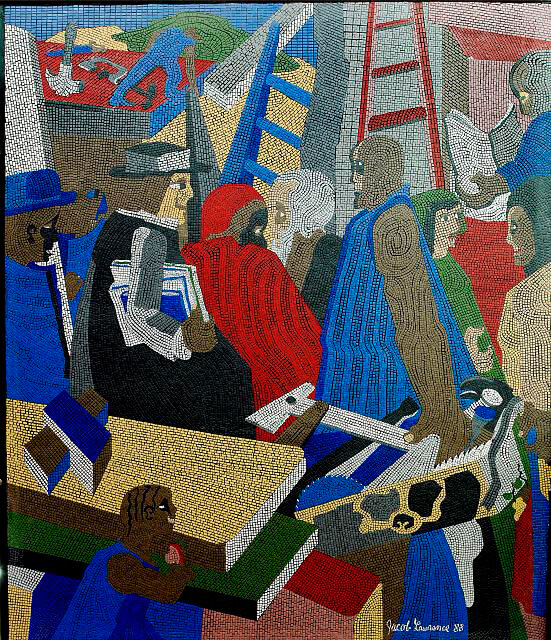 Community, ceramic tile mosaic on lobby wall of the Joseph P. Addabbo Federal Building, Jamaica, Queens, New York by Jacob Lawrence, 1989. Photograph of mosaic by Carol M. Highsmith. Courtesy of Library of Congress, Prints and Photographs Division, Carol M. Highsmith Archive, LC-DIG-highsm-02817. |