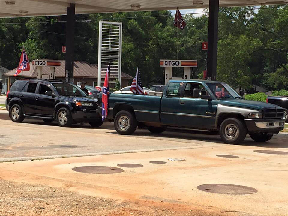 To be sure, the reenactors felt no kinship with the flag's defenders. During the two hour program inside the church sanctuary prior to the motorcade, the reenactment organizers referred to the adjacent white gathering as a "Klan rally." Former state representative Tyrone Brooks joked that he might just go up to them and "see if they need a speaker." Some attendees posted photographs of the flag-bearing trucks in an adjacent gas station on social media; if nothing else, several people told me with a tight smile, the profusion of rebel flags and the heavily armed militia members added a sense of verisimilitude to the reenactment. For all the jokes, though, there was a distinct sense of anxiety in the air. Even with the presence of Sheriff's deputies inside and outside the church, speakers noted that shots might ring out out at any time. One urged former state representative Brooks and others to write down the details about the lynching investigation: "You could be gunned down by the Klan today and all your knowledge would perish with you."